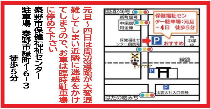 元旦~4日迄は境内周辺の道路が大変渋滞しますので、お車の方は保健福祉センター臨時駐車場をご利用ください。