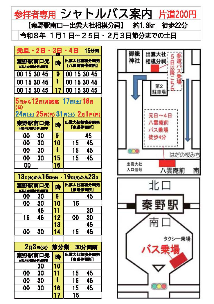 ① 1番線乗り場【秦18番系統 畑中経由(日立製作所経由) 秦野駅行】のバスに乗り、【出雲大社入口】あるいは【畑中】バス停下車、徒歩3分。